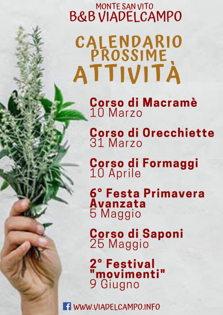 10 Aprile 2019 by Viadelcampo in Corsi Ecco il calendario con le nostre prossime attività…Corsi di Formaggio e Sapone, Mercatini, Feste… Prossimo appuntamento: Festa della primavera avanzata! Mercatini e giochi vi aspettano per festeggiare la fine dell’estate! Calendario Attività B&B Viadelcampo Facebook Twitter Google Plus LinkedIN Pinterest Share Corsi artistici corsi di cucina Tagged in